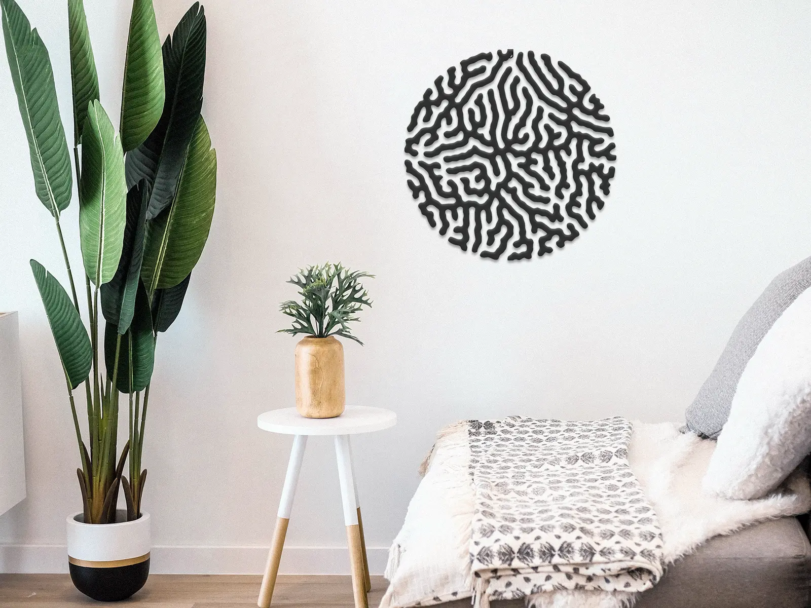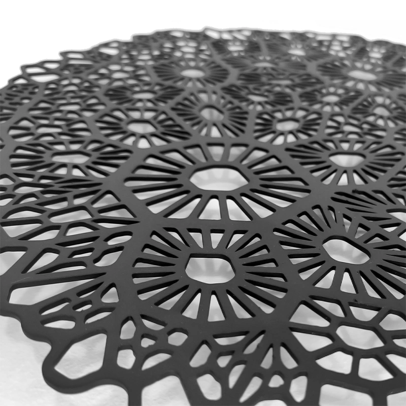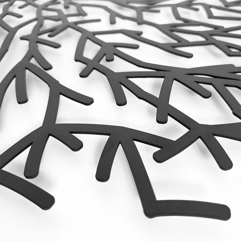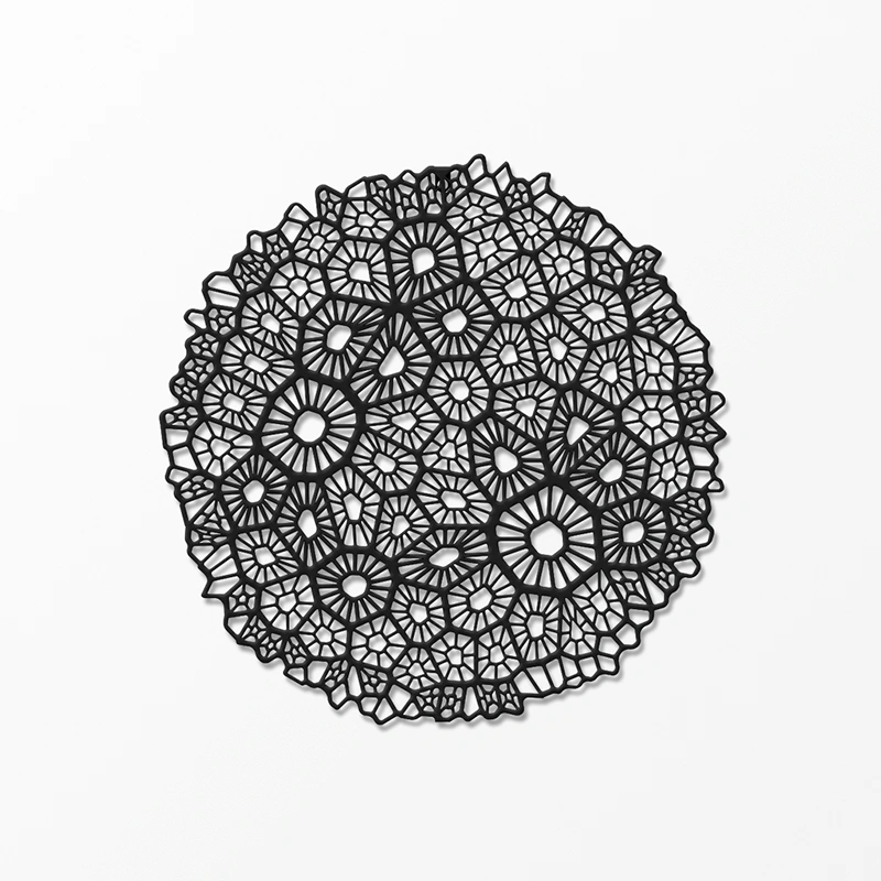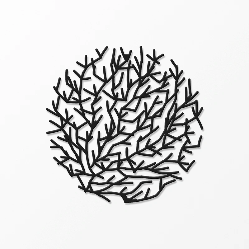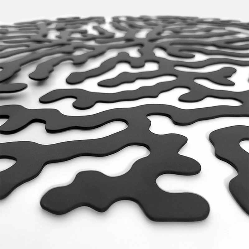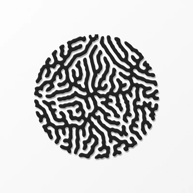 A collection of decorative wall pieces crafted in black metal, inspired by the living and fractal forms of the ocean. Each design captures the fluidity and complexity of marine ecosystems, reinterpreting corals, algae, and microscopic organisms into contemporary geometric compositions. "Black Ocean" merges digital precision with organic sensitivity to bring texture, rhythm, and depth to any interior space.